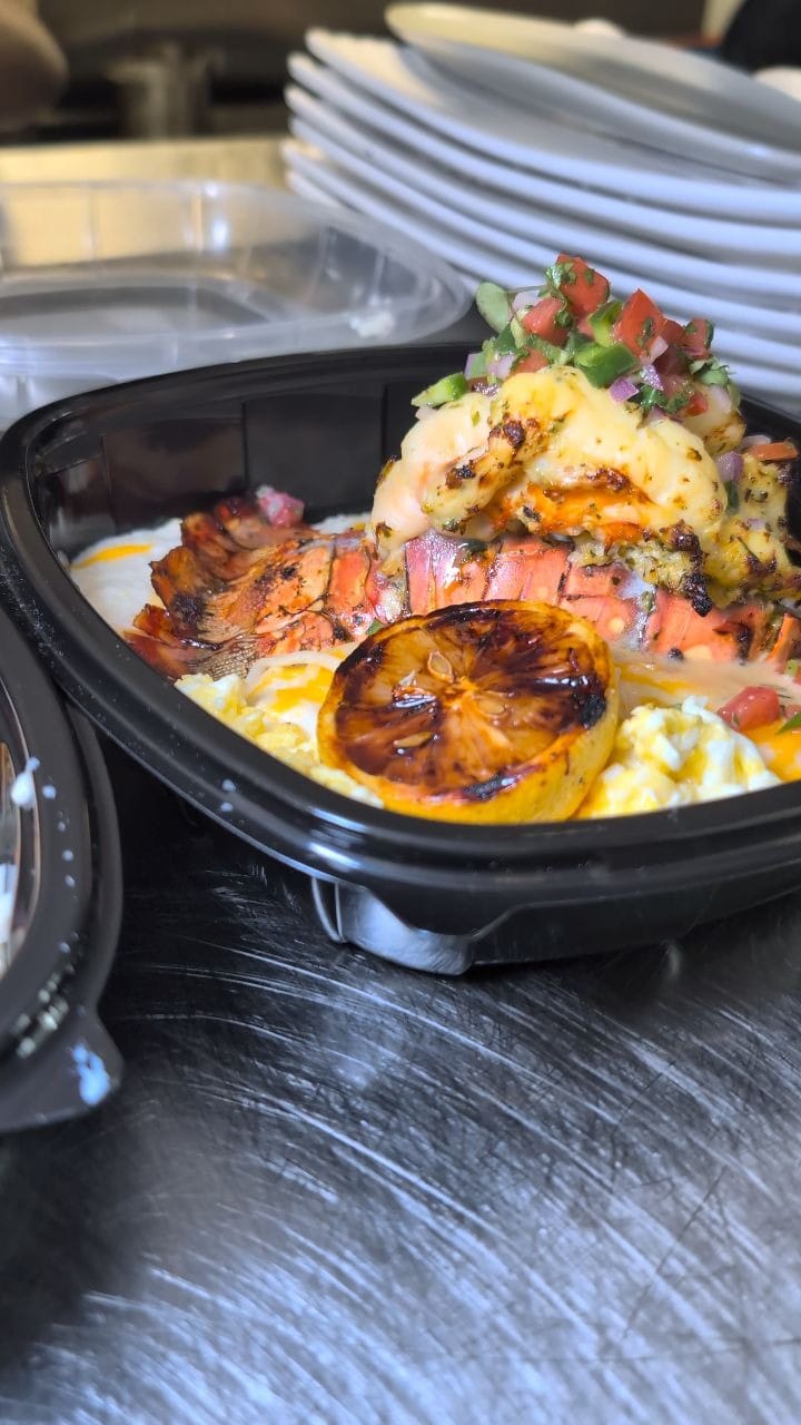 Customer favorites include catfish and grits, shrimp and grits, blackened salmon and grits, chicken and waffles, and oxtail and ackee. Brunch is a major part of the menu, featuring buttermilk pancakes and French toast.