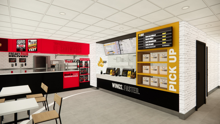 Jimmy John’s will feature its own dedicated drive-thru, while Buffalo Wild Wings Go will operate primarily as a walk-in pickup concept.